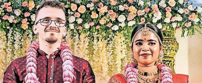 പെരുമ്പിലാവ് :കടൽ കടന്നെത്തിയ പ്രണയത്തിന് മലയാള മണ്ണിൽ സാഫല്യം തിപ്പിലിശേരിയുടെ മരുമകനായി ഇനി റുമാനിയക്കാരൻ ആൻഡ്രിയും തിപ്പിലിശേരി ചക്കും കുമരത്ത് സുനിലിൻ് മകൾ അഞ്ജനയാണ് ഒന്നര വർഷത്തെ പ്രണയത്തിനൊടുവിൽ ഇന്നലെ ആൻഡ്രിയുടെ കഴുത്തിൽ വരണമാല്യം ചാർത്തിയത്. പന്നിത്തടം ടെൽകോൺ കൺവൻഷൻ സെൻററിൽ നടത്തിയ വിവാഹത്തിൽ അഞ്ജനയുടെ ബന്ധുക്കൾക്കും നാട്ടുകാർക്കും പുറമേ ആൻഡിയുടെ മാതാപിതാക്കളും സഹോദരിയും സഹോദരിയുടെ പ്രതിശ്രുത വരനു പങ്കെടുത്തു