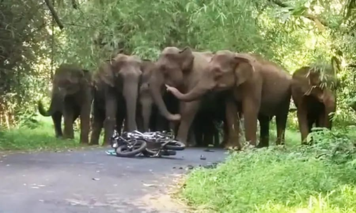 ചാലക്കുടി:ബൈക്ക് യാത്രികർ കാട്ടാനക്കൂട്ടത്തിൽനിന്ന് തലനാരിഴയ്ക്ക് രക്ഷപ്പെട്ടു. മലക്കപ്പാറയ്ക്ക് സമീപം ആനക്കയം വളവിൽ തിങ്കൾ രാവിലെയാണ് സംഭവം. കൊടുങ്ങല്ലൂരിൽനിന്ന് മലക്കപ്പാറയിലേക്ക് പോകുകയായിരുന്ന രണ്ടുപേരാണ് രക്ഷപ്പെട്ടത്. ആനക്കയം വളവ് തിരിയുന്നതിനിടെയാണ് ബൈക്ക് യാത്രികർ ആനക്കൂട്ടത്തിന് മുന്നിൽപ്പെട്ടത്. ആനയെ കണ്ട് ഭയന്ന ഇവർ ബൈക്ക് ഉപേക്ഷിച്ച് ഓടി രക്ഷപ്പെട്ടു. ബൈക്കിനരികിൽ കിടന്ന ഹെൽമറ്റ് ആനക്കൂട്ടം ചവിട്ടിപ്പൊളിച്ചു. ഇതുവഴി വന്ന മറ്റ് വാഹനയാത്രികർ ഹോൺമുഴക്കിയാണ് ആനകളെ ഓടിച്ചുവിട്ടത്. ആനക്കൂട്ടം വനത്തിലേക്ക് കയറിപ്പോയതോടെ ബൈക്ക് യാത്രികർ ബൈക്കുമെടുത്ത് തിരികെപ്പോയി.
