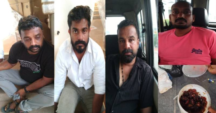വിദേശത്ത് നിന്നെത്തിയ 2 പേരും അവരെ കൂട്ടികൊണ്ടു വരാൻ പോയവരെയുമാണ് പിടികൂടിയത്. കല്ലമ്പലം സ്വദേശികളായ സഞ്ജു, നന്ദു, ഉണ്ണിക്കണ്ണൻ,പ്രവീൺ എന്നിവരാണ് ആറ്റിങ്ങൽ പൊലീസിന്റെ കസ്റ്റഡിയിൽ ഉള്ളത്. ഏകദേശം 5 കോടിയോളം രൂപ വിലയുള്ള ലഹരി വസ്തുക്കളാണിത്.