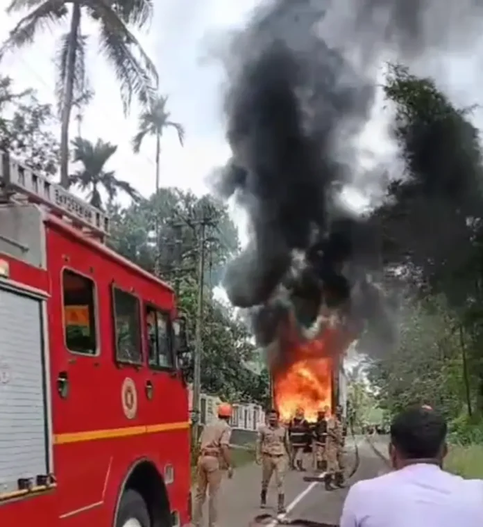 കൊടകര:ഓടിക്കൊണ്ടിരുന്ന കണ്ടെയ്നർ ലോറിക്ക് തീ പിടിച്ചു. പാറേക്കാട്ടുകരയിൽ വ്യാഴാഴ്ച പകൽ 11 ഓടെ ആയിരുന്നു സംഭവം. കിടക്ക നിർമാണക്കമ്പനിയിലേക്ക് നിർമാണ സാമഗ്രികളുമായി വന്ന ലോറിക്കാണ് തീ പിടിച്ചത്. ലോറി വൈദ്യുതി ലൈനിൽ തട്ടിയതാണ് തീപിടിത്തത്തിന് കാരണം എന്ന് സംശയിക്കുന്നു. കൊടകര സഹൃദയ കോളേജിന് സമീപത്ത് വച്ച് ലോറിയുടെ പിന്നിൽനിന്ന് പുക ഉയരുന്നത് കണ്ട ബൈക്ക് യാത്രികൻ ഡ്രൈവറെ വിവരം അറിയിക്കുകയായിരുന്നു. തുടർന്ന് ലോറിയുടെ ഡ്രൈവർ ഭാഗ്യരാജ് വീടുകൾ കുറവുള്ള ഭാഗത്ത് ലോറി നിർത്തി. ചാലക്കുടിയിൽ നിന്ന് മൂന്ന് യൂണിറ്റ് ഫയർ ഫോഴ്സ് എത്തിയാണ് തീയണച്ചത്. ആളൂർ പൊലീസും സ്ഥലത്തെത്തി.45 കെട്ട് നിർമാണ സാമഗ്രികളാണ് ലോറിയിൽ ഉണ്ടായിരുന്നത്. അതിൽ 27 കെട്ടും നശിച്ചു.