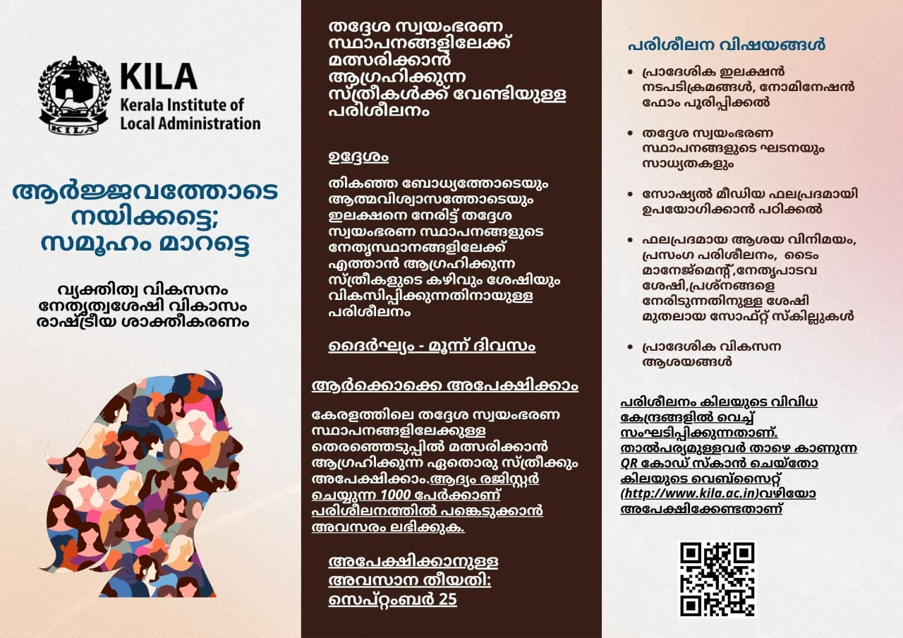 തികഞ്ഞ ബോധ്യത്തോടെയും ആത്മവിശ്വാസത്തോടെയും ഇലക്ഷനെ നേരിട്ട് തദ്ദേശ സ്വയംഭരണ സ്ഥാപനങ്ങളുടെ നേതൃസ്ഥാനങ്ങളിലേക്ക് എത്താൻ ആഗ്രഹിക്കുന്ന സ്ത്രീകളുടെ കഴിവും ശേഷിയും വികസിപ്പിക്കുന്നതിനായുള്ള പരിശീലനമാണ് മൂന്ന് ദിവസങ്ങളിലായി കില ഒരുക്കുന്നത്.