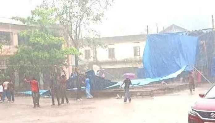 കലോത്സവത്തിന്റെ ആദ്യ ദിവസമായിരുന്നു ഇന്ന്. രാവിലെ മുതൽ നിലനിന്ന ശക്തമായ മഴയും കാറ്റും കാരണം പല വിദ്യാർത്ഥികളും വേദിയിൽ ഉണ്ടായിരുന്നില്ല, സമീപ കെട്ടിടങ്ങളിലായിരുന്നു കൂടുതലും. ഇതുവഴി വലിയ അപകടം ഒഴിവായി. തകർന്ന വേദിഭാഗങ്ങൾക്കിടയിൽ രക്ഷാപ്രവർത്തകർ പരിശോധന നടത്തി, ആരും കുടുങ്ങിയിട്ടില്ലെന്ന് ഉറപ്പിച്ചു.