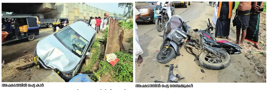 കയ്പമംഗലം :കാളമുറിയിൽ ബൈക്കുകളും കാറും കൂട്ടിയിടിച്ച് മൂന്നുപേർക്ക് പരിക്കേറ്റു. വെള്ളി രാവിലെ 9.30ഓടെ ദേശീയപാത സർവീസ് റോഡിലായിരുന്നു അപകടം. രണ്ട് ബൈക്കുകളും കാറുമാണ് കൂട്ടിയിടിച്ചത്. അപകടത്തിൽ ബൈക്ക് യാത്രക്കാരായ കയ്പമംഗലം കൂരിക്കുഴി സ്വദേശി പുതിയവീട്ടിൽ മുഹമ്മദ് സലീം (47), ഭാര്യ സീനത്ത് (36), വലപ്പാട് സ്വദേശി മുഹമ്മദ് സാബിത്ത് (21) എന്നിവർക്ക് പരിക്കേറ്റു. ഇവരെ കൊടുങ്ങല്ലൂരിലെ സ്വകാര്യ ആശുപത്രിയിൽ പ്രവേശിപ്പിച്ചു. തെലങ്കാനയിൽ നിന്നുള്ള അയ്യപ്പഭക്തരാണ് കാറിലുണ്ടായിരുന്നത്. ഇവർ പരിക്കേൽക്കാതെ രക്ഷപ്പെട്ടു.
