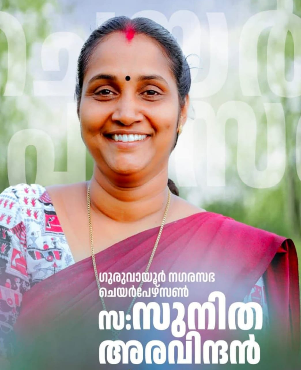 ഗുരുവായൂര്:നഗരസഭ ചെയര്പേഴ്സനായി സി.പി.ഐ എമ്മിലെ സുനിത അരവിന്ദനെ തെരഞ്ഞെടുത്തു. 40ാം വാര്ഡ് കൗണ്സിലറാണ് സുനിത. 27 വോട്ട് നേടിയാണ് സുനിത വിജയിച്ചത്. എതിര് സ്ഥാനാര്ത്ഥിയായി മത്സരിച്ച ബിന്ദു നാരായണന് 17 വോട്ട് ലഭിച്ചു. അധ്യക്ഷ സ്ഥാനത്തേക്ക് സുനിതയുടെ പേര് കെ.കെ. ജ്യോതിരാജ് നിര്ദേശിച്ചു. ബിന്ദു അജിത് കുമാർ പിന്താങ്ങി. യു.ഡി.എഫ് സ്ഥാനാർത്ഥി ബിന്ദുവിനെ ബഷീർ പൂക്കോട് നിർദ്ദേശിച്ചു, റഷീദ് കുന്നിക്കൽ പിന്താങ്ങി. സ്വതന്ത്രയായി വിജയിച്ച ലിസി ബൈജു എൽ.ഡി.എഫിനാണ് വോട്ട് ചെയ്തത്. രണ്ട് അംഗങ്ങളുള്ള ബി.ജെ.പി യോഗത്തിൽ നിന്ന് വിട്ടുനിന്നു.