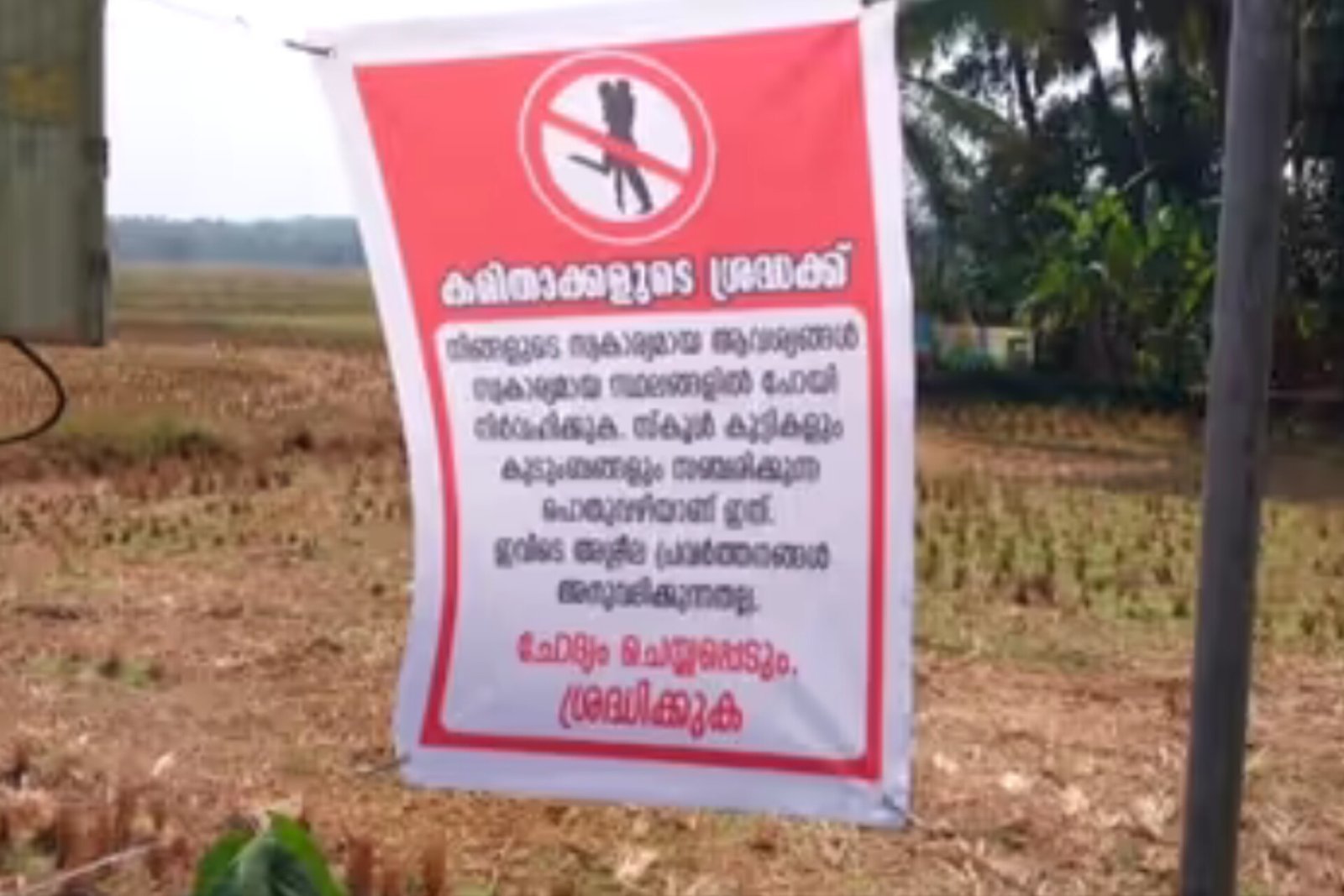 തൃശൂർ: പ്രണയിക്കാനും സ്വകാര്യങ്ങൾ പങ്കുവെക്കാനും സമ്മതിക്കില്ലന്ന പ്രഖ്യാപനവുമായി കമിതാക്കൾക്കെതിരെ വിചിത്ര മുന്നറിയിപ്പ് ബോർഡ്. പോർക്കുളം പഞ്ചായത്തിലെ കുതിരപ്പാടത്തുള്ള റോഡിലാണ് ബോർഡ് പ്രത്യക്ഷപ്പെട്ടത്. മൂന്ന് വർഷം മുമ്പാണ് റോഡിനിരുവശവും നടപ്പാത നിർമ്മിച്ച് കട്ട വിരിച്ചു മനോഹരമാക്കിയത്. വിജനമായ പ്രദേശമായതിനാൽ പകൽ സമയങ്ങളിൽ യുവതി- യുവാക്കൾ ഈ റോഡിലെ തണൽമരങ്ങളുടെ ചുവട്ടിൽ വന്നിരിക്കാറുണ്ട്. സ്ക്കൂൾ കുട്ടികളും കുടുംബങ്ങളും ഇതുവഴി സഞ്ചരിക്കുന്നതു കൊണ്ട് കമിതാക്കൾ വന്ന് ചോദ്യം ചെയ്യപ്പെടുമെന്നാണ് ബോർഡിലൂടെ ഭീഷണി മുഴക്കിയിരിക്കുന്നത്. ഇതേ റോഡരികിൽ മരങ്ങളുടെ ചുവട്ടിൽ സുഹൃത്തുക്കളും കമിതാക്കളുൾപ്പെടെ സംസാരിച്ചിരിക്കുന്നത് പതിവാണ്. ആരാണ് ബോർഡ് സ്ഥാപിച്ചിതിന് പിന്നിലെന്ന കൃത്യമായ സൂചനയും ലഭിച്ചിട്ടില്ല. പാടത്തിനോട് ചേർന്ന് പാതയോരത്ത് മദ്യക്കുപ്പികളും ഭക്ഷണാവശിഷ്ടങ്ങളും ചിതറിക്കിടക്കുന്നതും നിത്യേനയുള്ള കാഴ്ചയാണ്.
