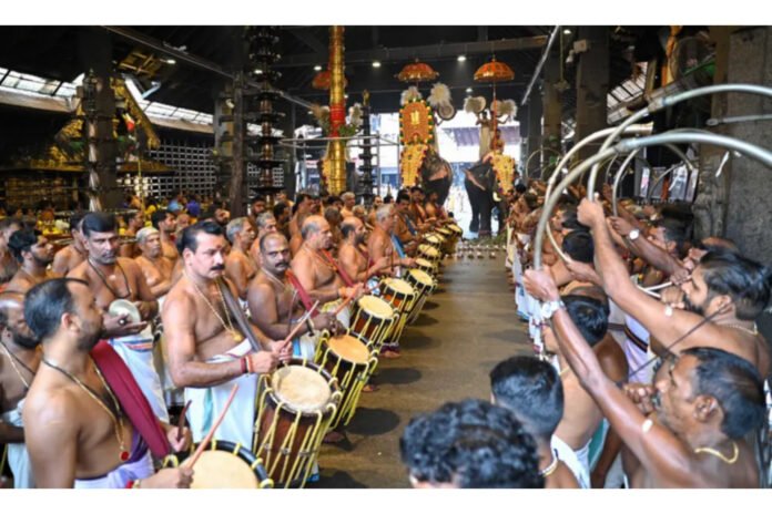 ഗുരുവായൂർ:സ്വർണക്കോലത്തിൻ്റെ പൊൻപ്രഭയിൽ അലിഞ്ഞ് ഗുരുവായൂർ ക്ഷേത്രോത്സവത്തിൻ്റെ ആറാംനാൾ. വ്യാഴാഴ്ച വൈകിട്ട് നടന്ന ഉച്ചശീവേലിക്കാണ് ക്ഷേത്രത്തിൽ സ്വർണക്കോലം എഴുന്നള്ളിച്ചത്. മുത്തുക്കുട, ആലവട്ടം, വെഞ്ചാമരം, സൂര്യമറ, കൊടിക്കൂറകൾ, തഴ എന്നിവ അഴകേകിയ സ്വർണക്കോലം എഴുന്നള്ളിച്ച ശീവേലി കാണാനായി ആയിരങ്ങൾ ക്ഷേത്രത്തിലെത്തി. ആനയോട്ട മത്സര വിജയി രവികൃഷ്ണൻ ക്ഷേത്രത്തിനകത്ത് മൂന്ന് പ്രദക്ഷിണം പൂർത്തിയാക്കിയശേഷം നാലാമത്തെ പ്രദക്ഷിണത്തിൽ കൊമ്പൻ ഇന്ദ്രസെൻ സ്വർണക്കോലമേറ്റി ശീവേലി എഴുന്നള്ളിപ്പിന്റെ നേതൃത്വം ഏറ്റെടുത്തു. കൊമ്പന്മാരായ ദേവദാസും അക്ഷയ് കൃഷ്ണയും പറ്റാനകളായി. പെരുവനം കുട്ടൻ മാരാർ, തിരുവല്ല രാധാകൃഷ്ണൻ, ചൊവ്വല്ലൂർ മോഹനൻ, കോട്ടപ്പടി സന്തോഷ് മാരാർ എന്നിവരുടെ നേതൃത്വത്തിൽ മേളക്കൊഴുപ്പേകി. ഇനി ഉത്സവാവസാനം വരെ ക്ഷേത്രത്തിൽ സ്വർണക്കോലം എഴുന്നള്ളിപ്പ് നടക്കും. വ്യാഴാഴ്ച രാത്രി ക്ഷേത്രം വടക്കിനി മുറ്റത്ത് സ്വർണപഴുക്കാ മണ്ഡപം എഴുന്നള്ളിച്ചു. കോട്ടപ്പുറം