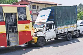തൃശ്ശൂർ ഭാഗത്തേക്ക് പോയിരുന്ന ബസിന് പിറകിൽ പിക്കപ്പ് വാനും അതിന് പിന്നിൽ കാറുമാണ് വന്നിടിച്ചത്.അപകടത്തിൽ ആർക്കും പരിക്കില്ല. വെള്ളിയാഴ്ച‌ രാവിലെ പത്തരയോടെയായിരുന്നു അപകടം. ദേശീയപാതയിൽ സ്റ്റാൻഡിന് എതിർവശത്ത് അശ്രദ്ധമായി നിർത്തി യാത്രക്കാരെ ഇറക്കിയ കെ.എസ്.ആർ.ടി.സി. ബസിനെ മറികടക്കാൻ ശ്രമിച്ച ടോറസ് ലോറിയിൽ ഇടിക്കാതിരിക്കാൻ പിറകിൽ വന്ന സൂപ്പർഫാസ്റ്റ് ബസ് പെട്ടെന്ന് ബ്രേയ്ക്കിട്ടതാണ് അപകടകാരണം.