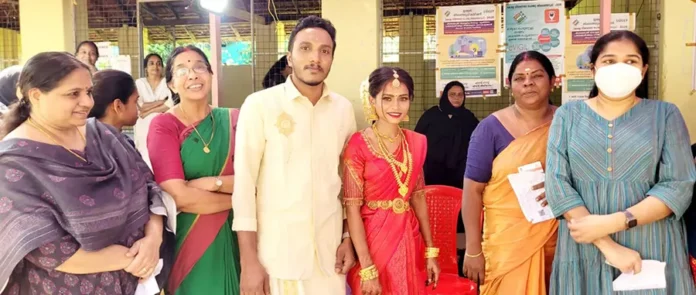 തളിക്കുളം:കതിർമണ്ഡപത്തിൽനിന്ന് വോട്ട് ചെയ്യാൻ നന്ദന പോളിങ് ബൂത്തിലേക്ക്. തളിക്കുളം പുളിയംതുരുത്തിൽ താമസിക്കുന്ന സുകുമാരൻ- ബിന്ദു ദമ്പതികളുടെ മകൾ നന്ദനയുടെ വിവാഹമാണ് വോട്ടിങ് ദിവസം ശ്രദ്ധേയമായത്. താലികെട്ട് കഴിഞ്ഞ ഉടൻ തളിക്കുളം പത്താം കല്ലിലെ സിഎംഎസ് യുപി സ്കൂളിലെ എട്ടാം ബൂത്തിൽ വരൻ ലിജീഷിനൊപ്പം വോട്ട് രേഖപ്പെടുത്തി. നന്ദന ഡിവൈഎഫ്ഐ പുളിയംതുരുത്ത് യൂണിറ്റ് അംഗമാണ്.